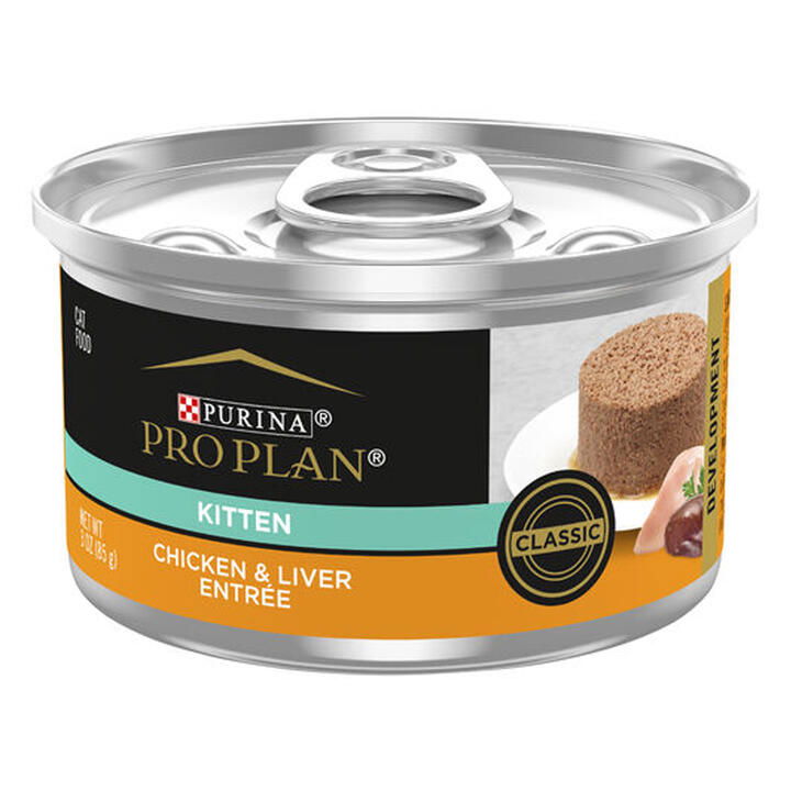 Pro Plan Kitten Chicken & Liver Entrée Wet Cat Food gives tender texture & essential nutrients for healthy growing kittens.
