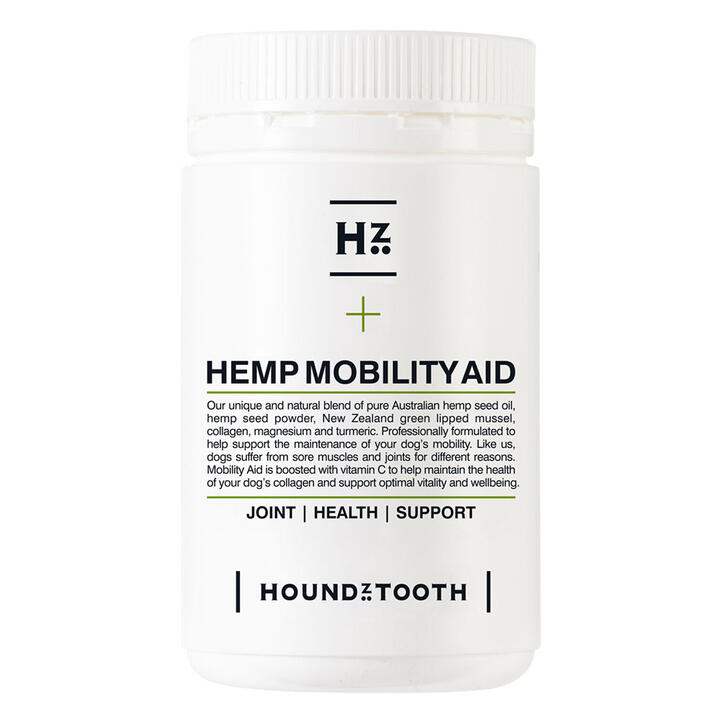 Houndztooth Hemp Mobility Aid supplement is a natural product that promotes joint health and enhances your dog's mobility and overall quality of life.