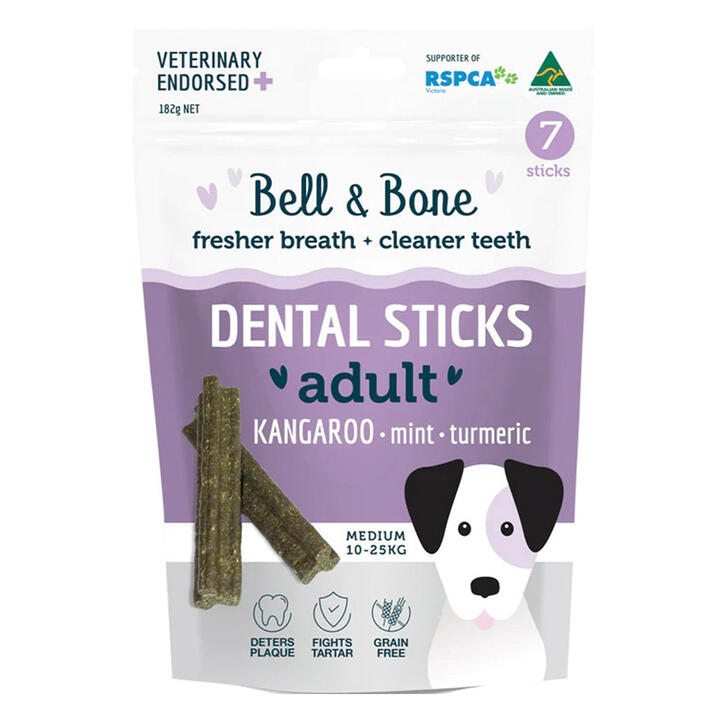 Get the benefits of Bell & Bone Dental Sticks with Kangaroo, Mint, and Turmeric. Support your dog's dental health with these nutritious and delicious treats. Available now at VetSupply