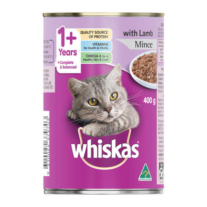 Whiskas 1+ Years Adult Wet Cat Food with Lamb Mince: This cat food helps maintain a healthy immune system, and the added omega-6 fatty acids promote a shiny coat.